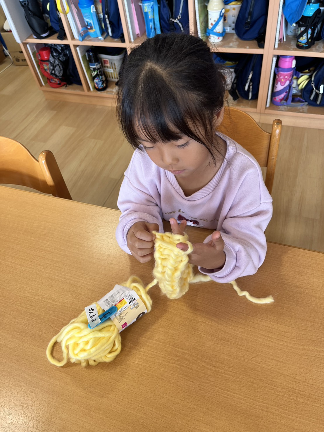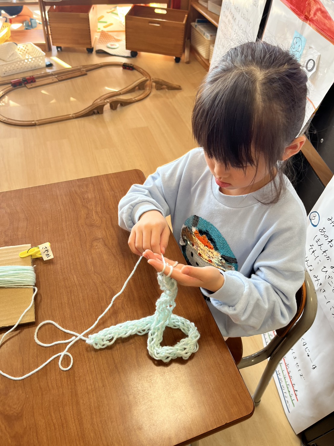 11月26日、指編みマフラー作成中。どんなマフラーになるかな?