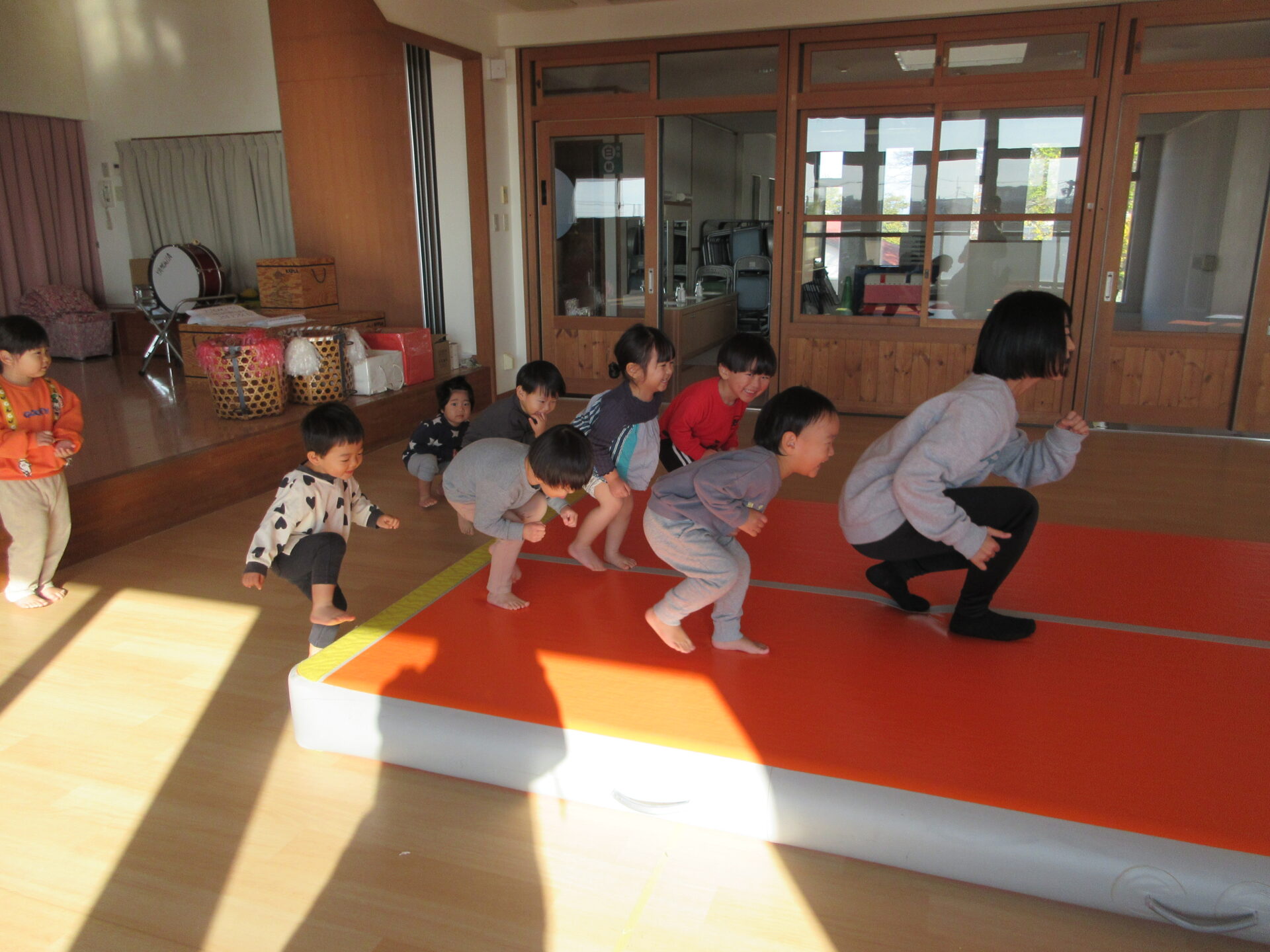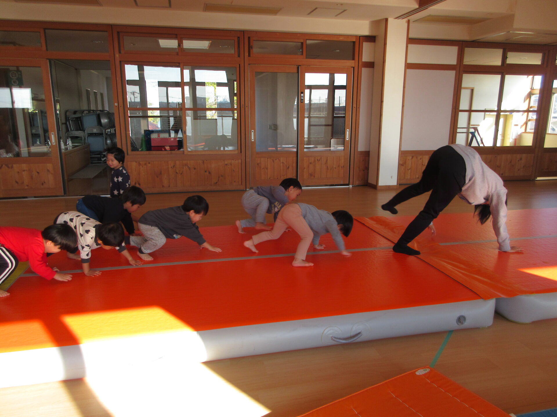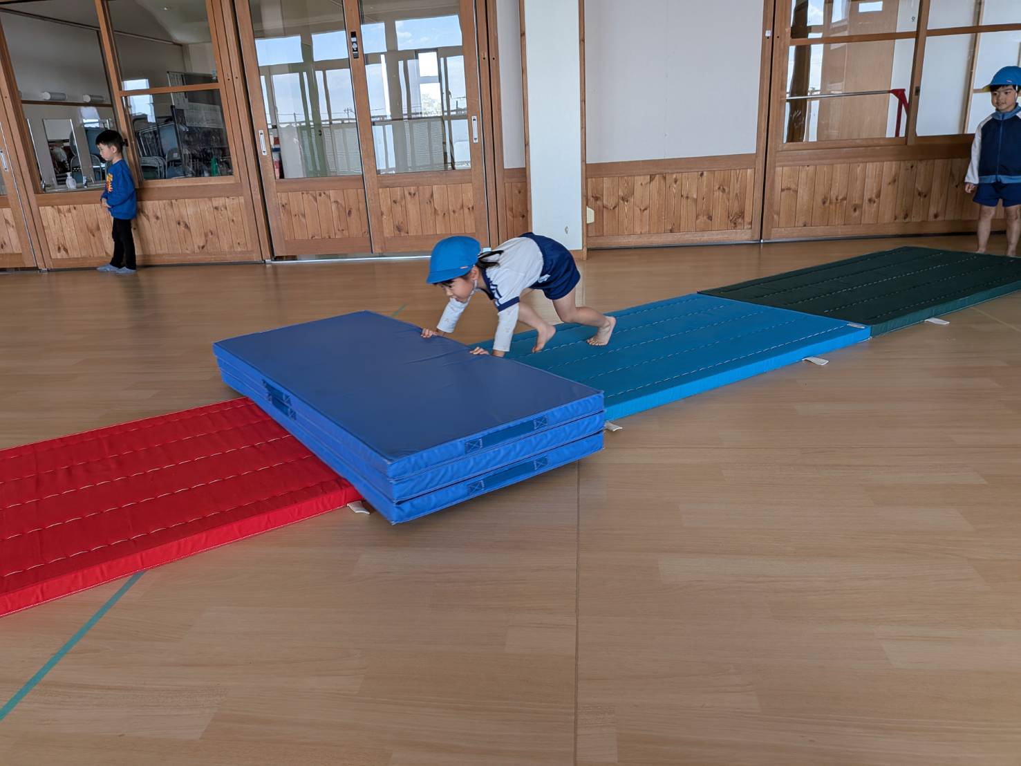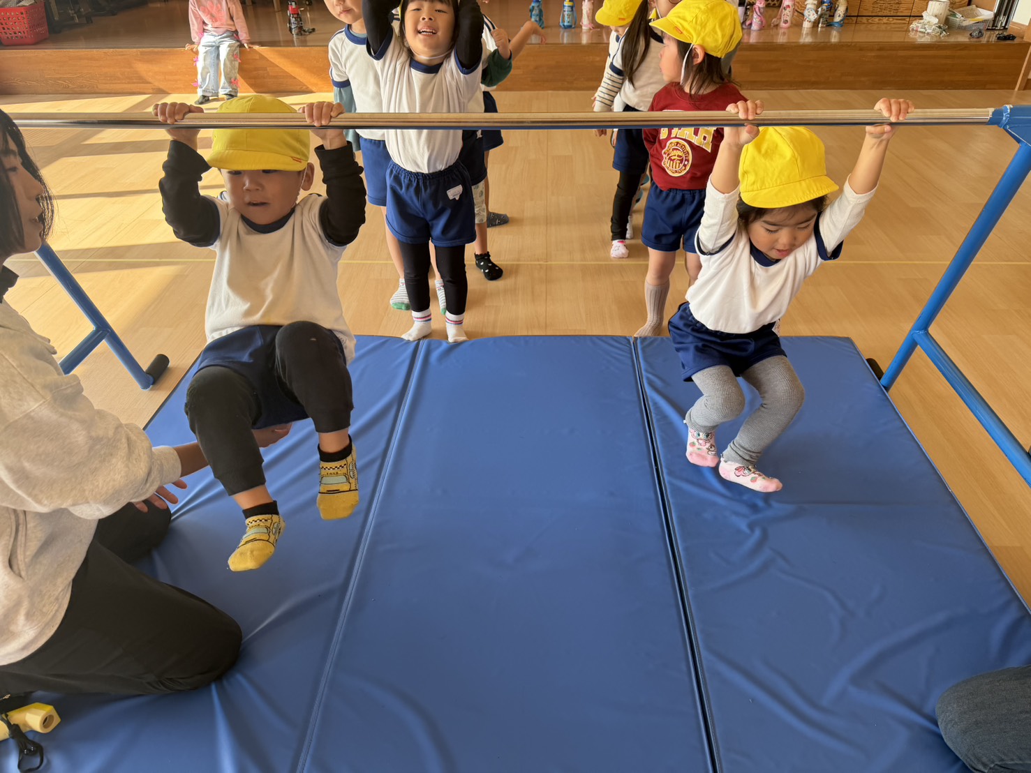 11月27日、体育あそびの様子。アザラシ(匍匐前進)→ワニ(匍匐前進)→ぶらさがり(鉄棒)→飛びつき(鉄棒)→ツバメ(鉄棒)でしっかりと腕の力を養うよ。すると、前回りができるようになるんだ!