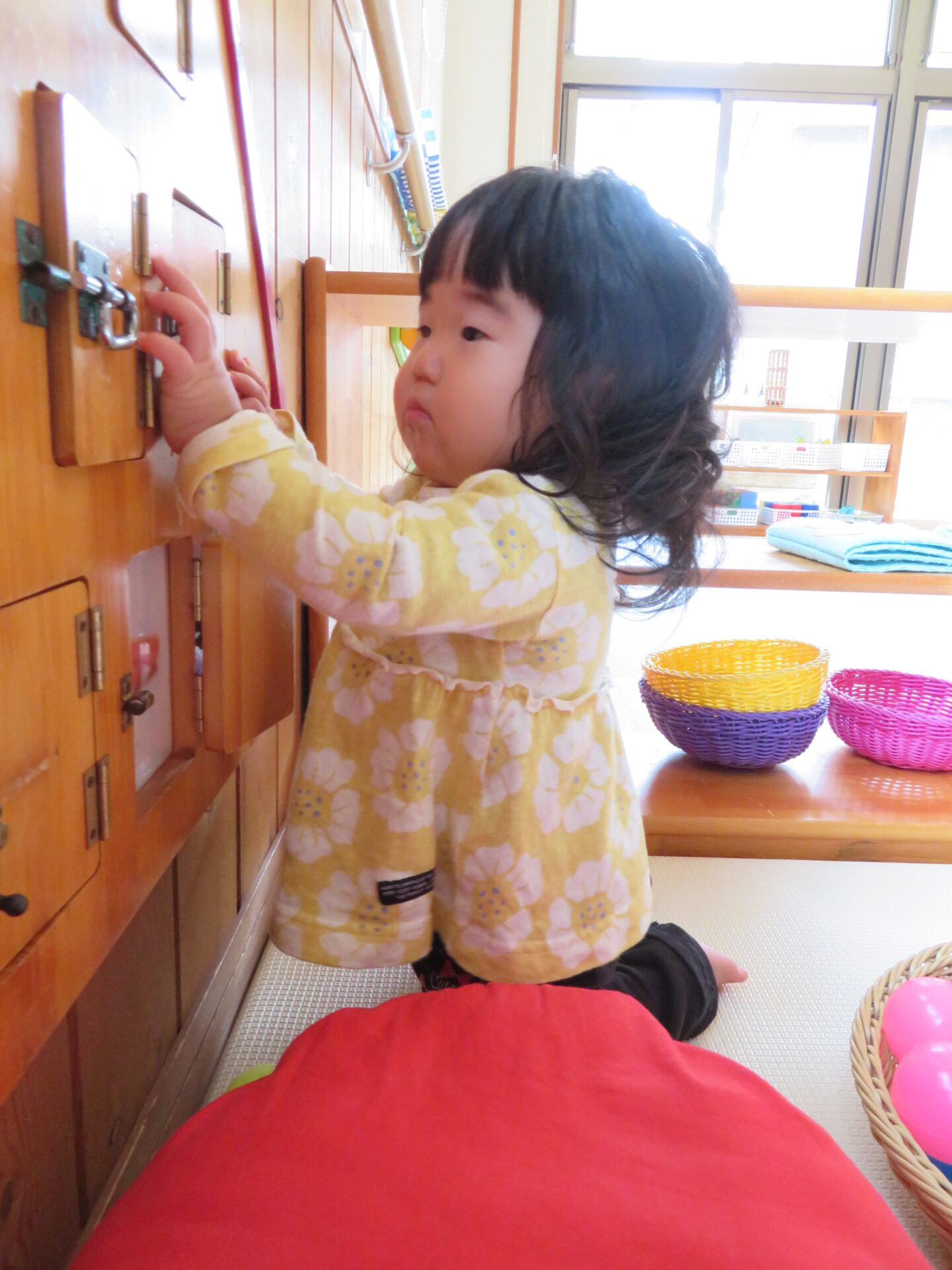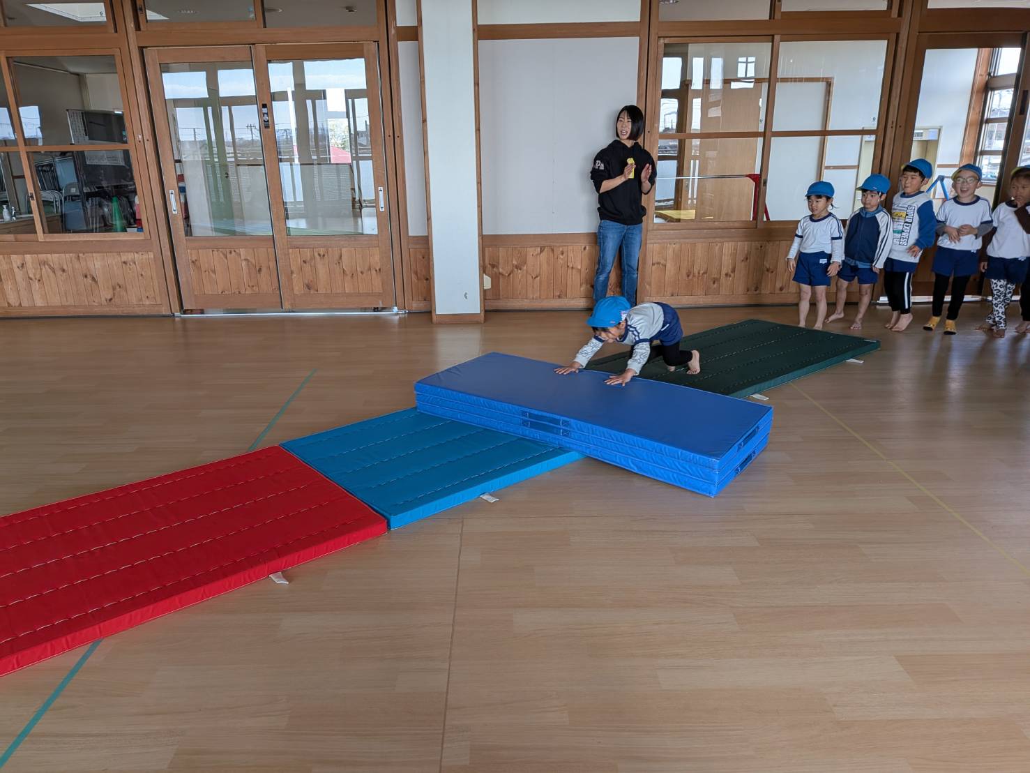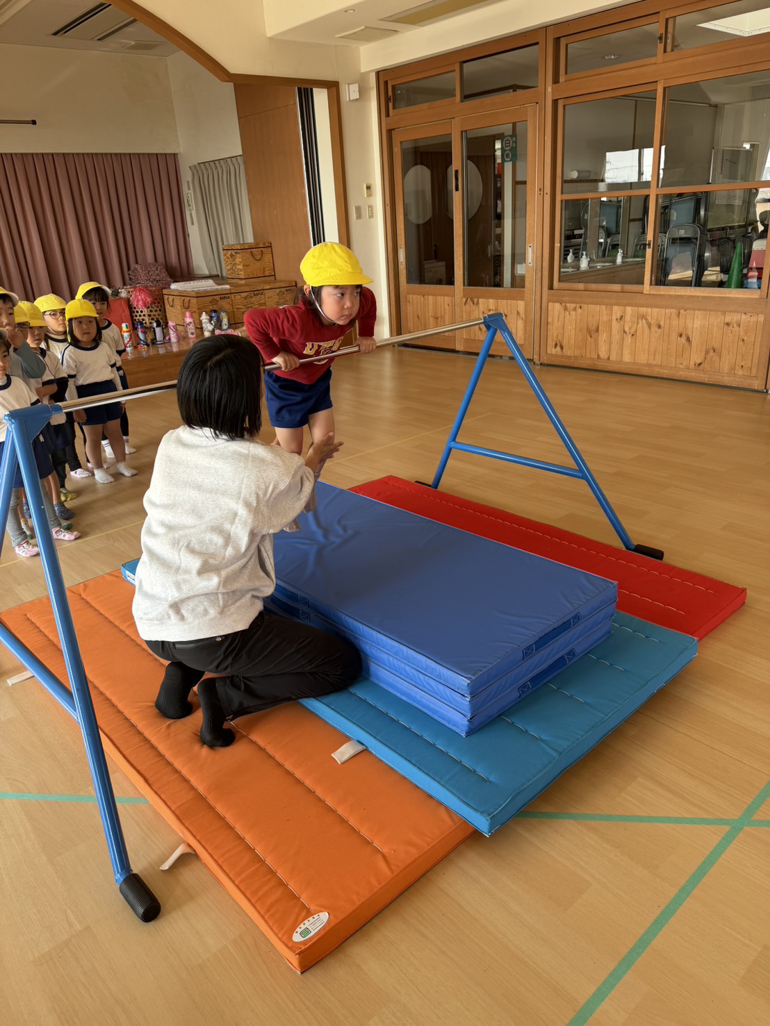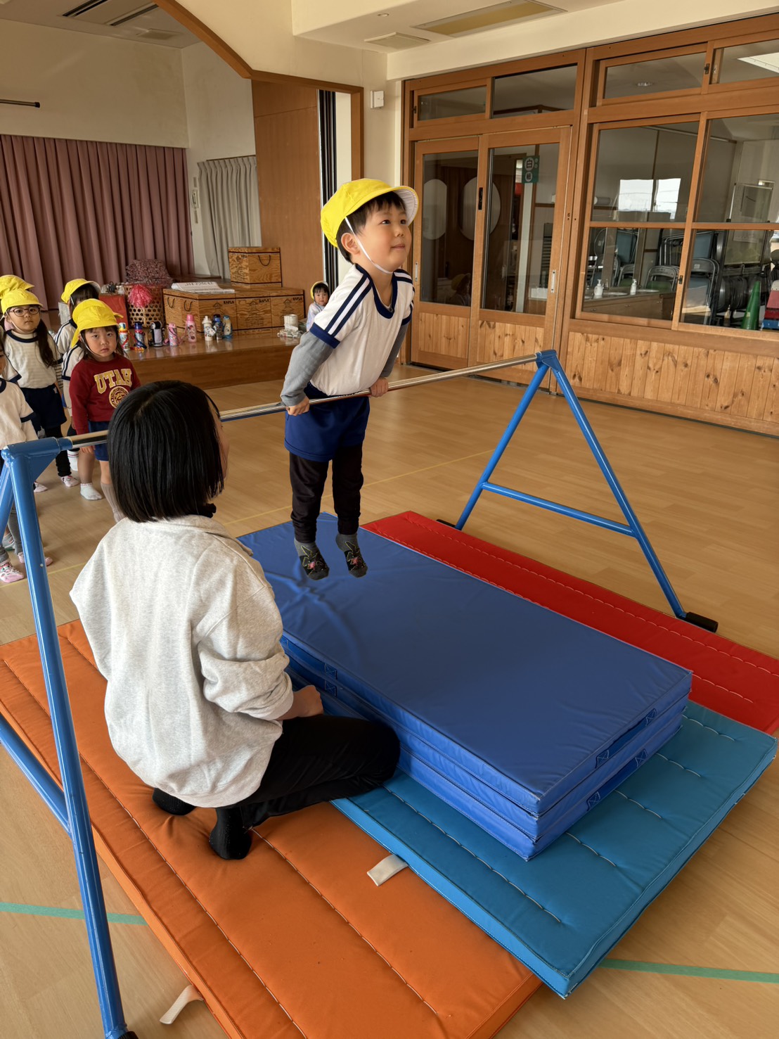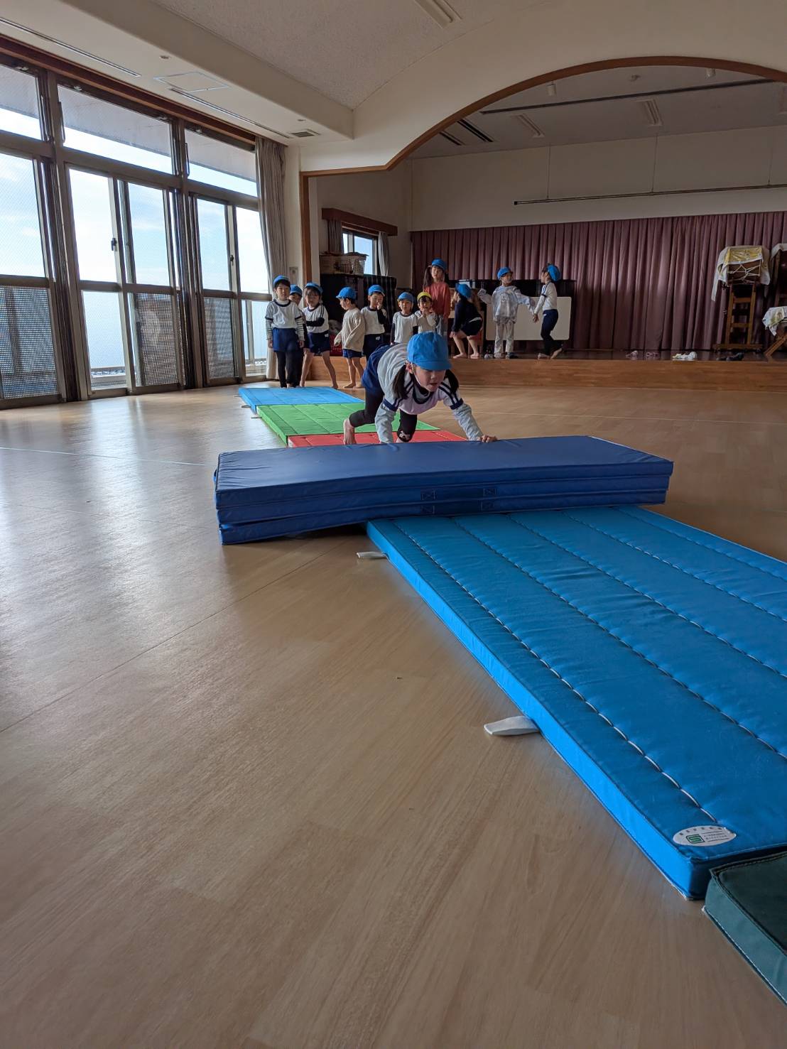 11月27日、体育あそびの様子。アザラシ(匍匐前進)→ワニ(匍匐前進)→ぶらさがり(鉄棒)→飛びつき(鉄棒)→ツバメ(鉄棒)でしっかりと腕の力を養うよ。すると、前回りができるようになるんだ!
