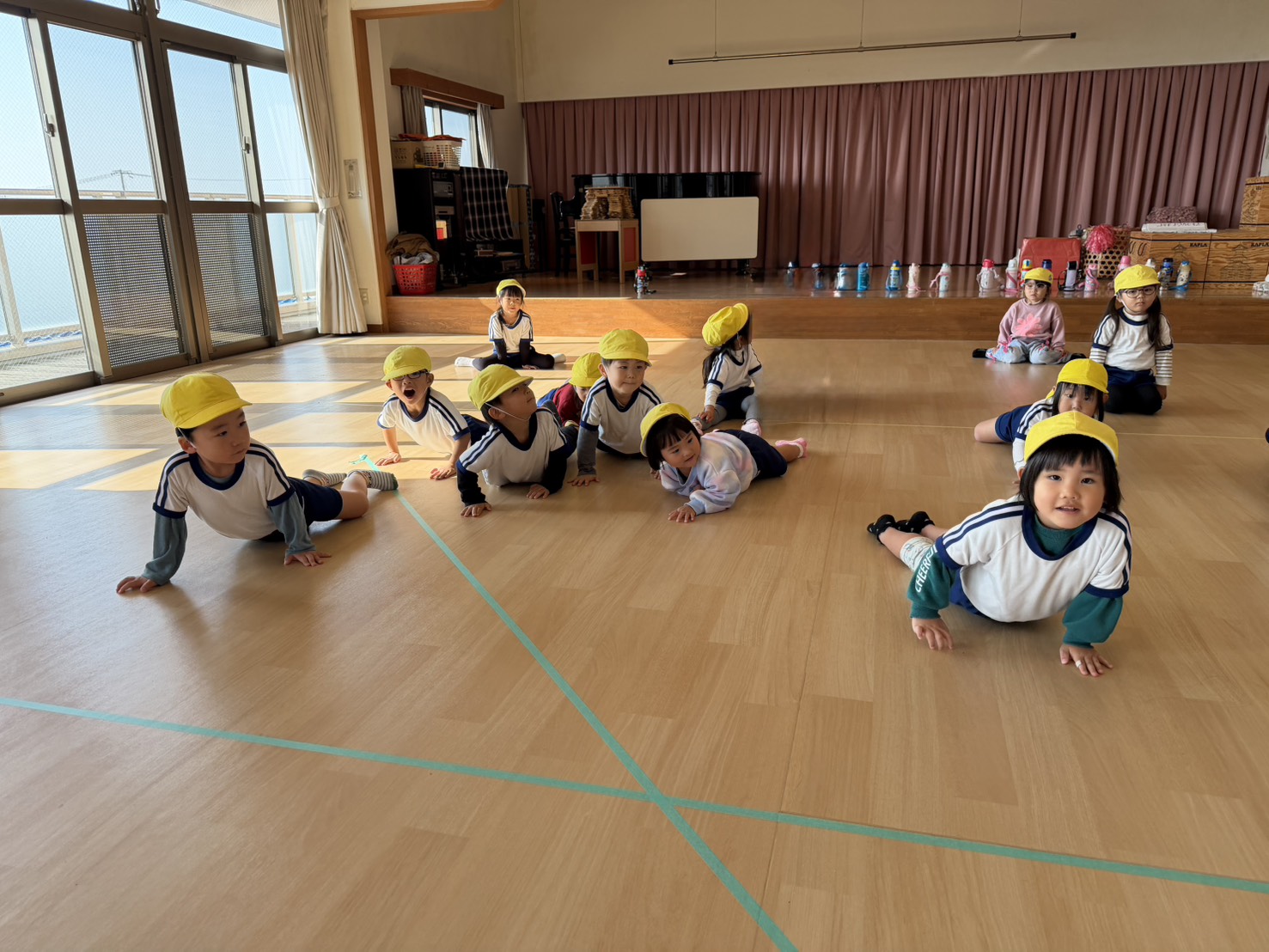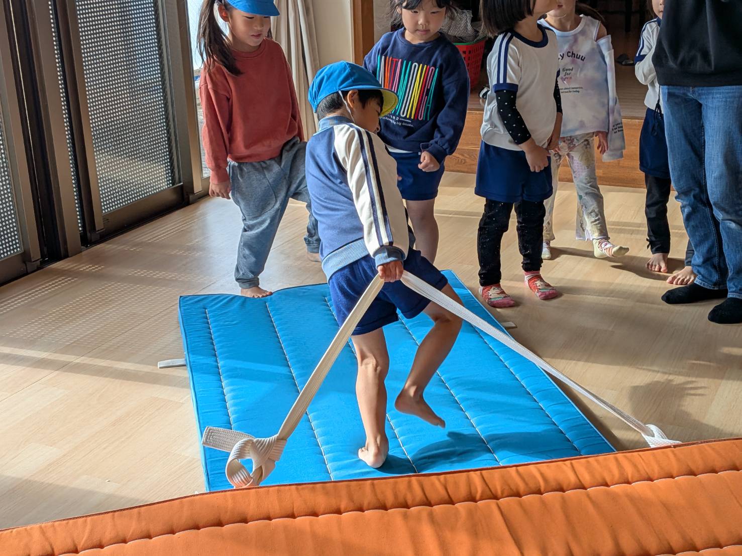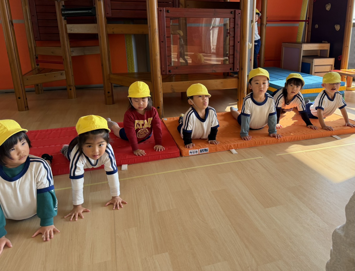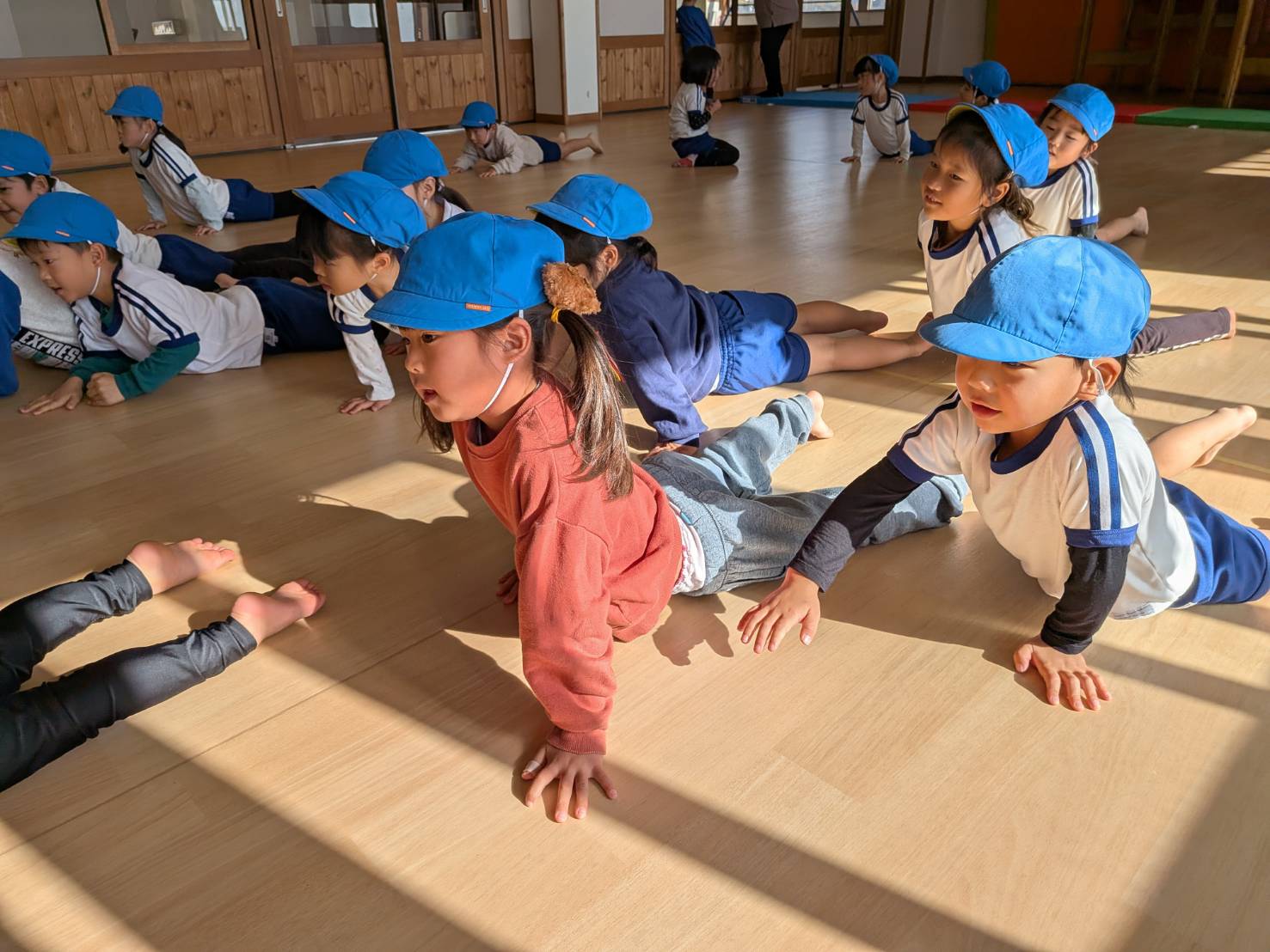11月28日4歳児の運動あそびのねらいは、鉄棒に必要な腕の力を身につけること。腕だけで歩く「ワニ歩き」「アザラシ歩き」、手を引っ張りあったり、マットを引っ張ったり押したり。たくさん腕を使って遊びました!