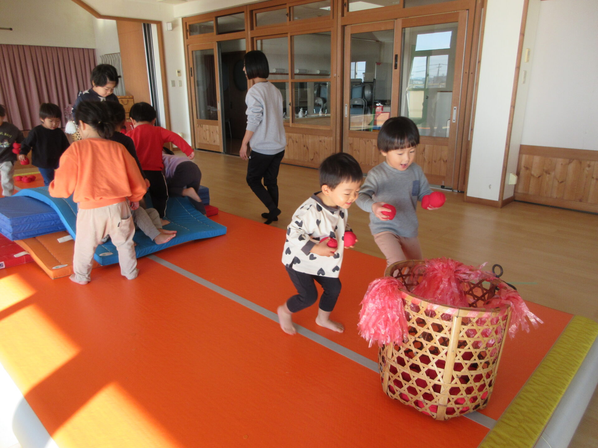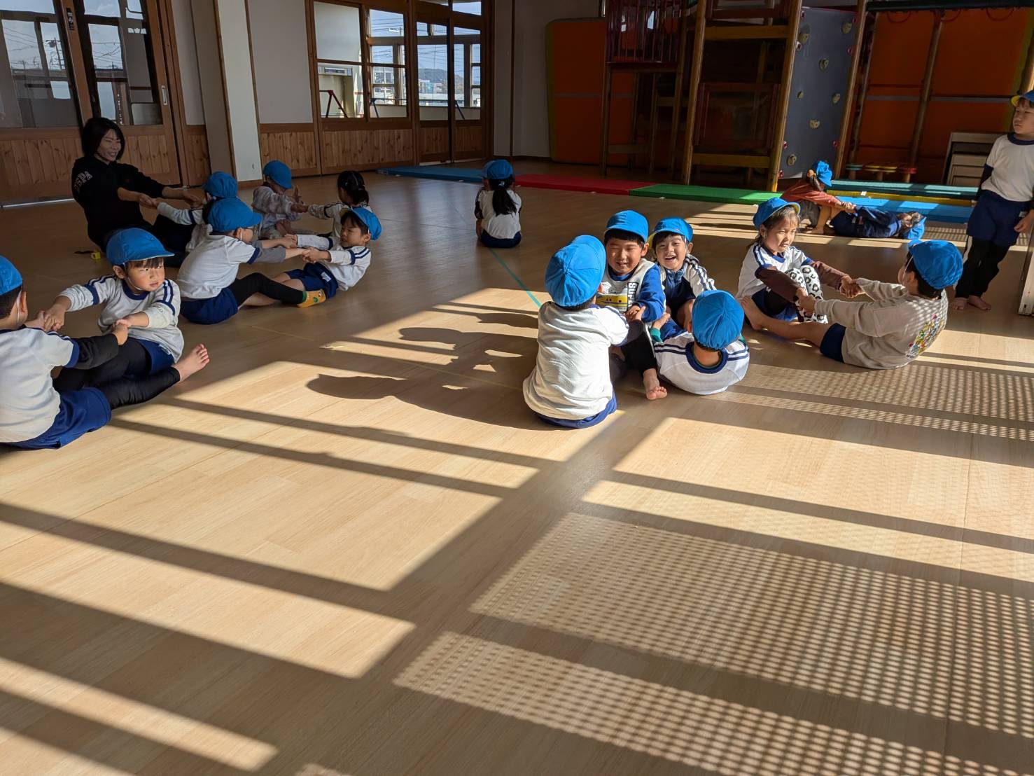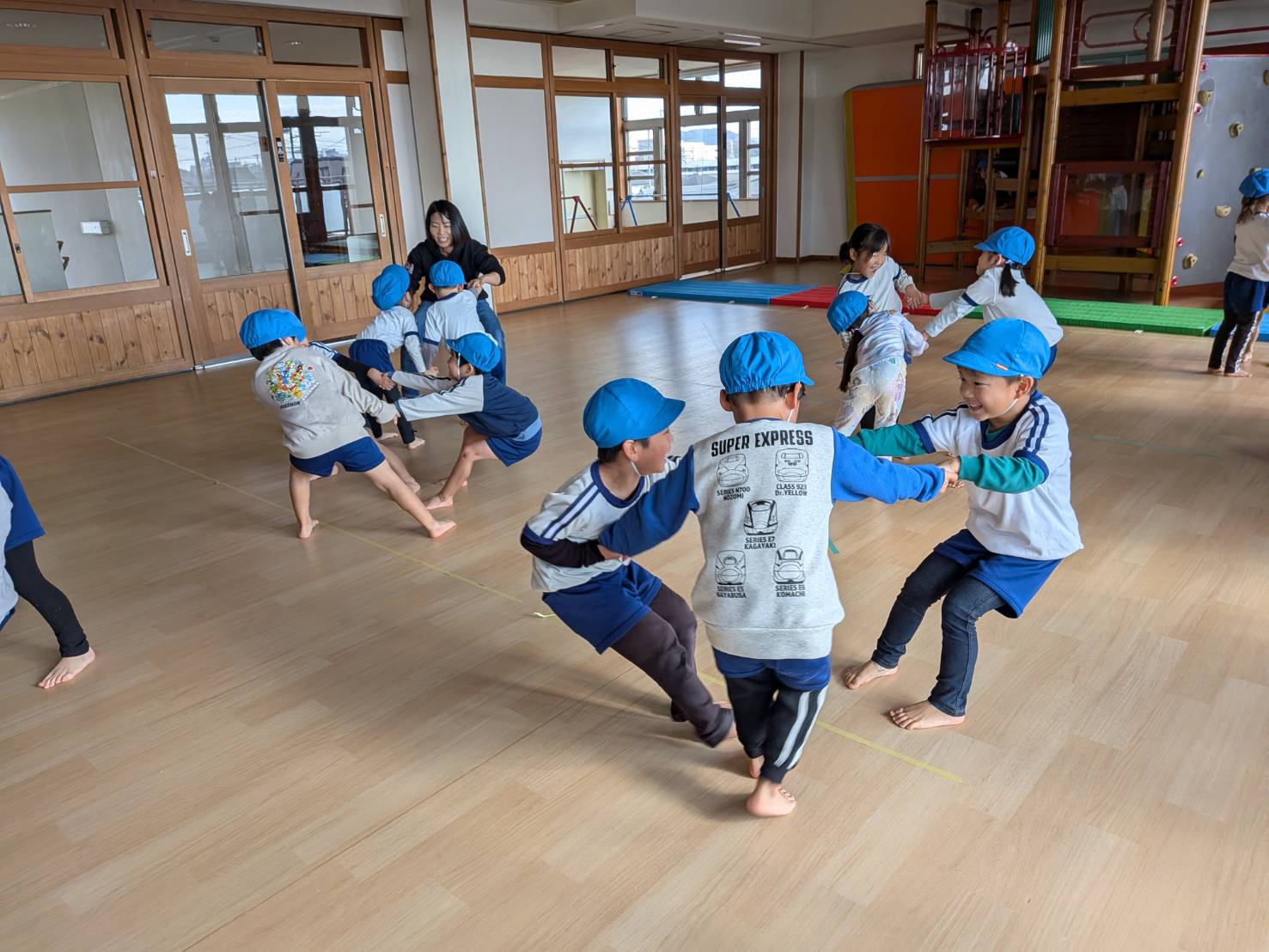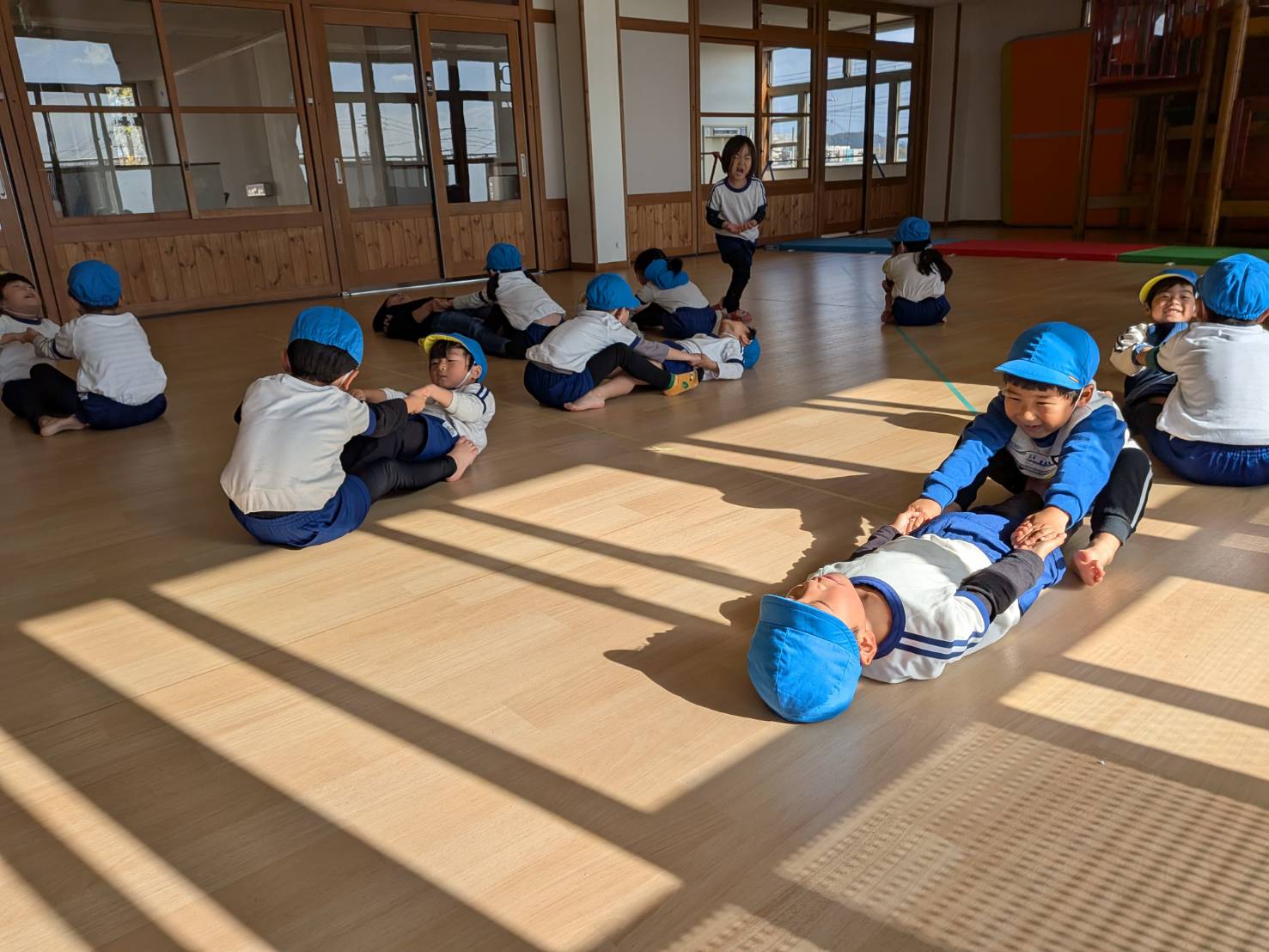 11月28日4歳児の運動あそびのねらいは、鉄棒に必要な腕の力を身につけること。腕だけで歩く「ワニ歩き」「アザラシ歩き」、手を引っ張りあったり、マットを引っ張ったり押したり。たくさん腕を使って遊びました!
