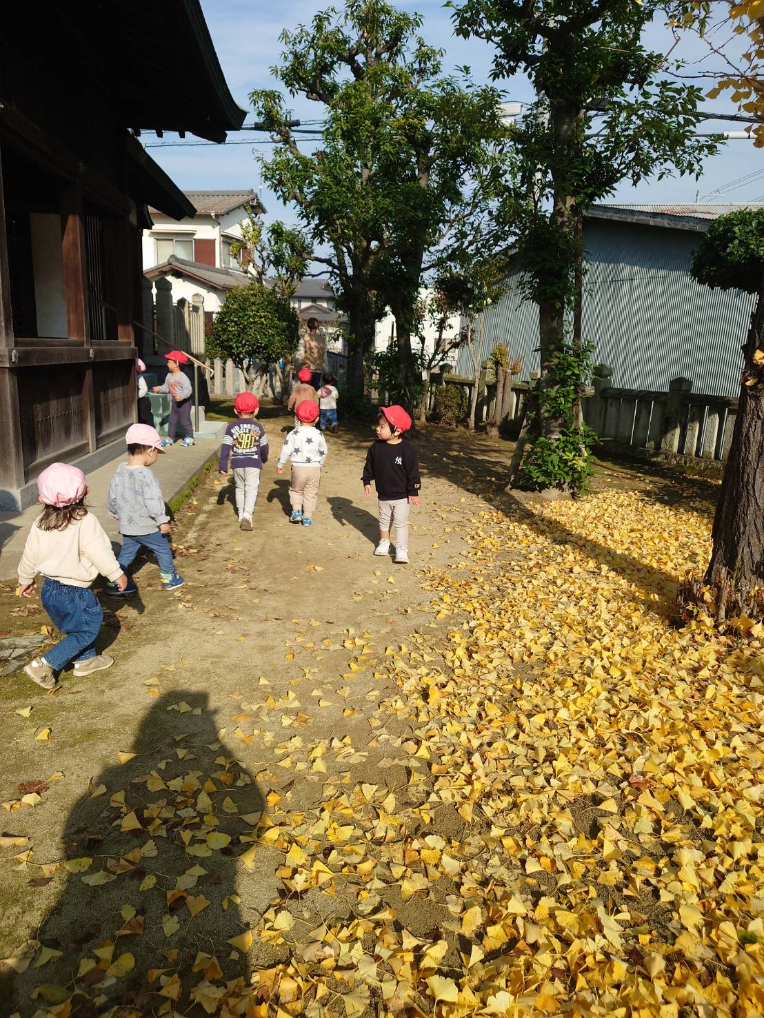 11月27日、荒神さんにお散歩へ。いちょうのじゅうたんみたい。サクサク音がするよ。