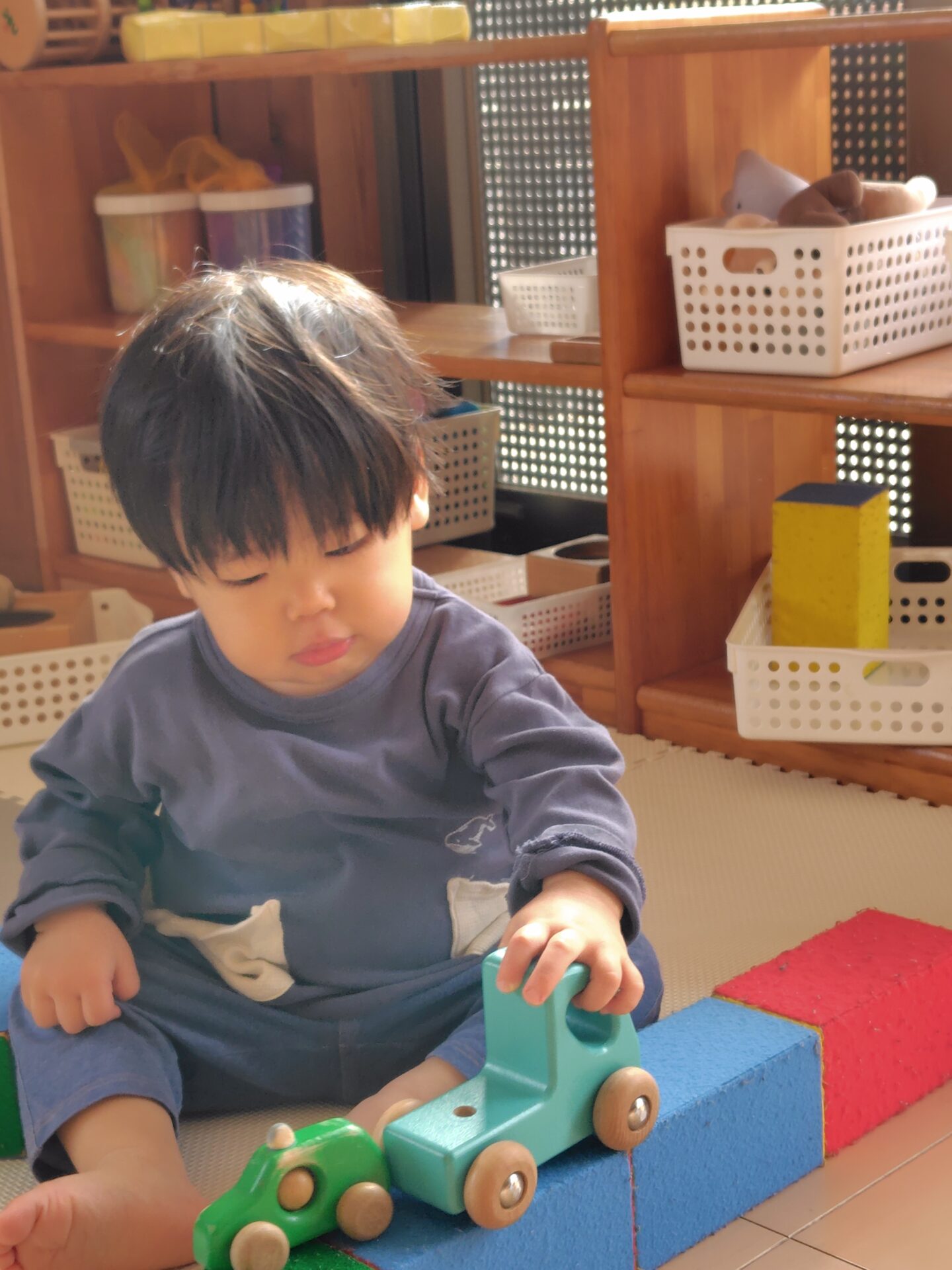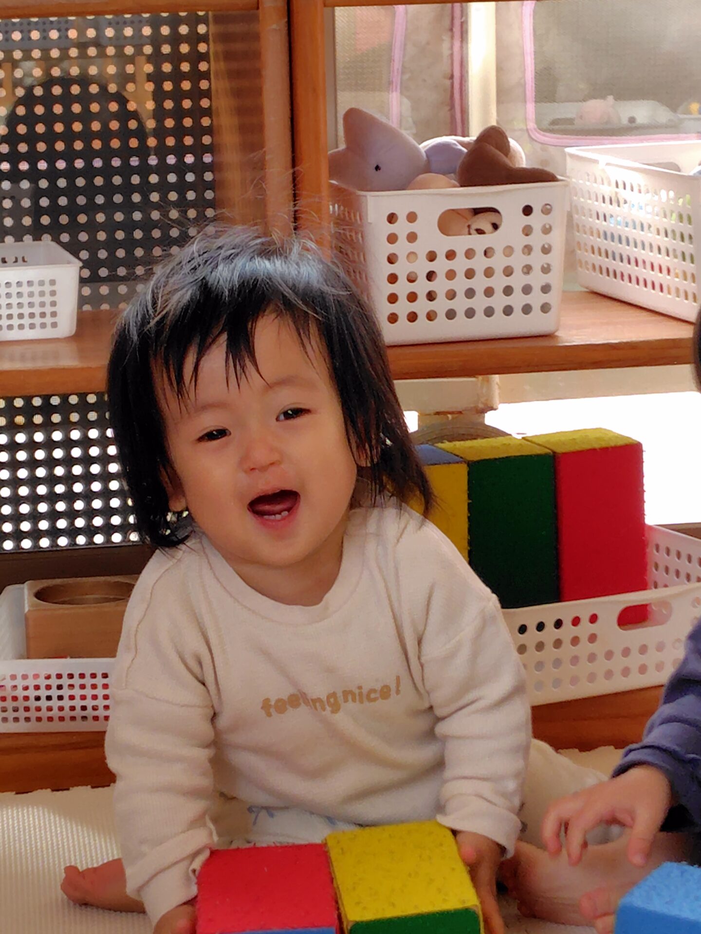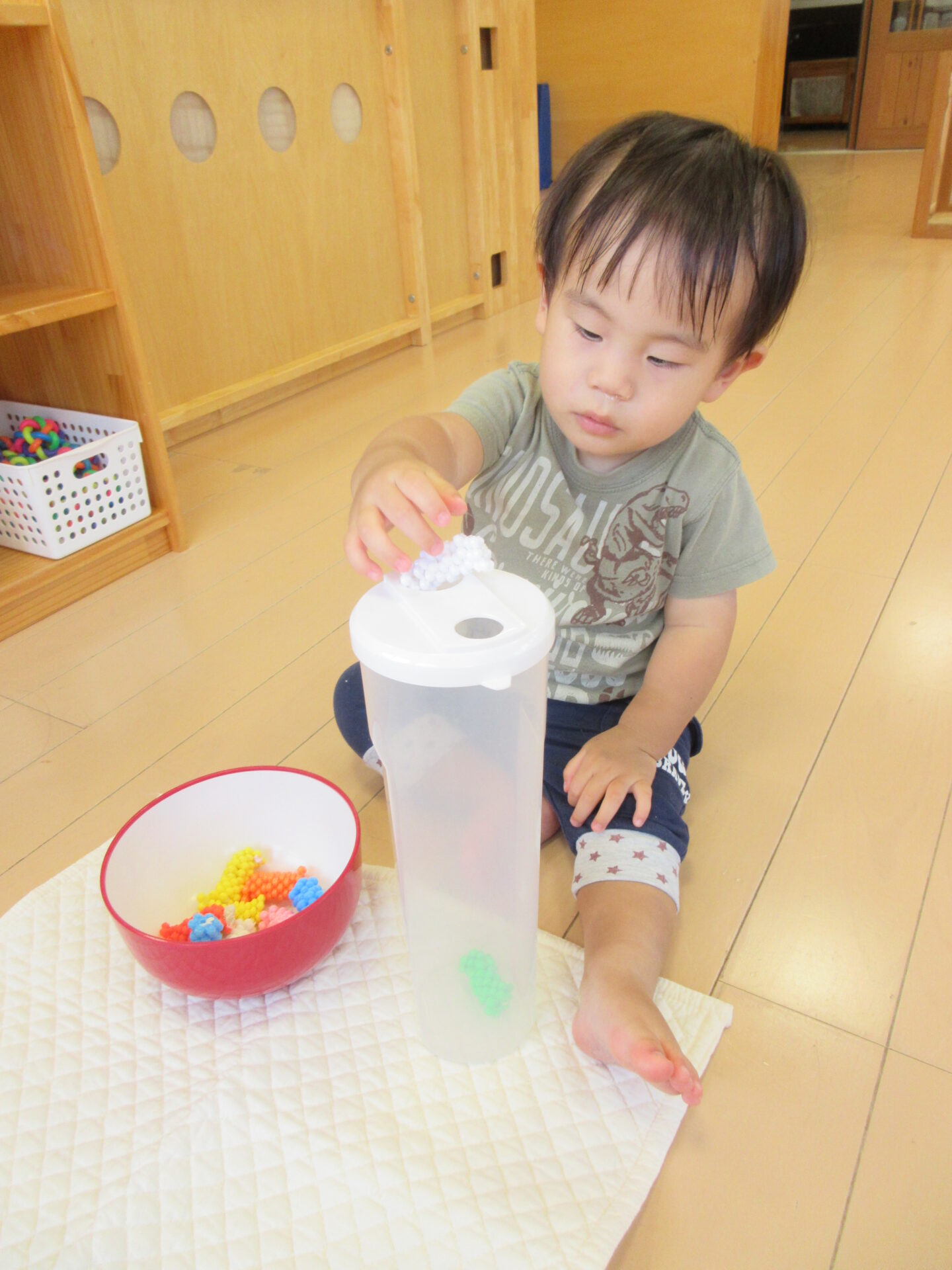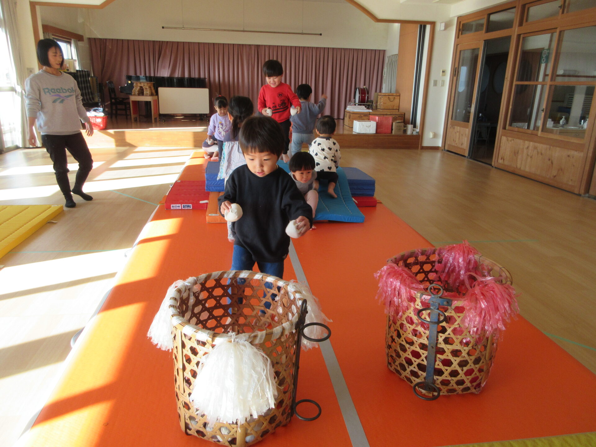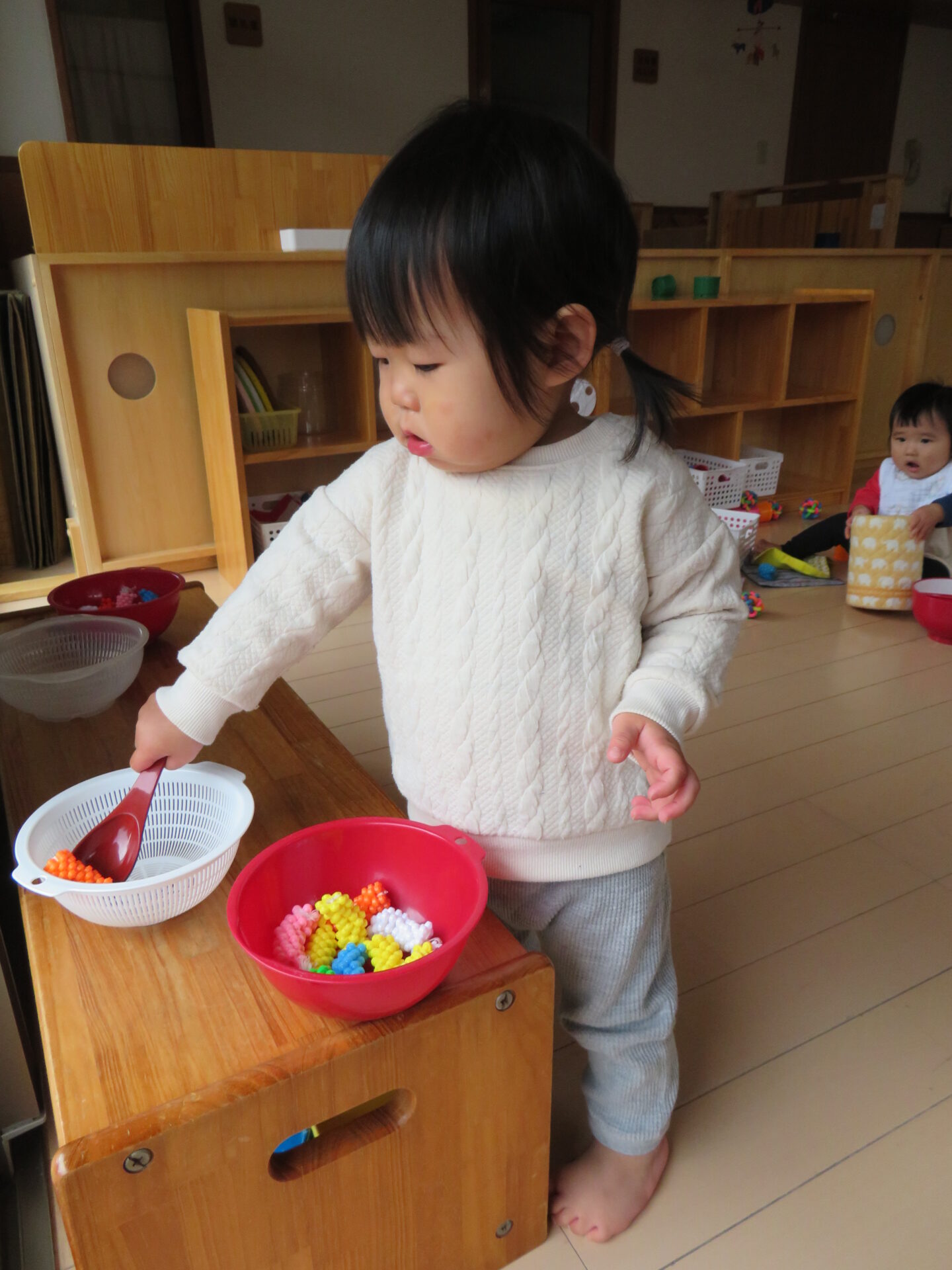 玉運びあそびを通して「しっかりと歩く足の力」「物をつかむ手指の力」「友達とぶつからないようによける力」を養うほか、色の認識も学べるよ。