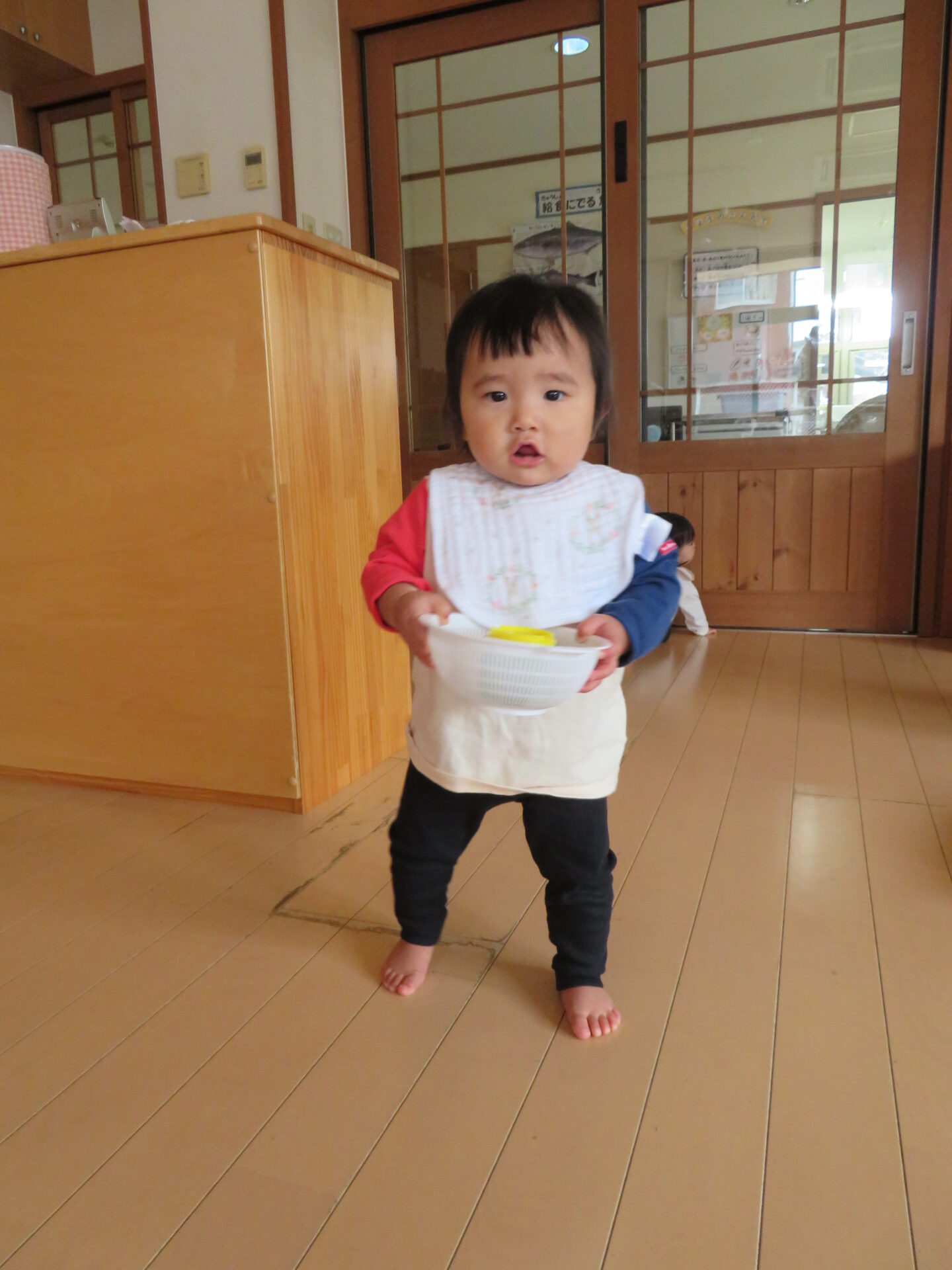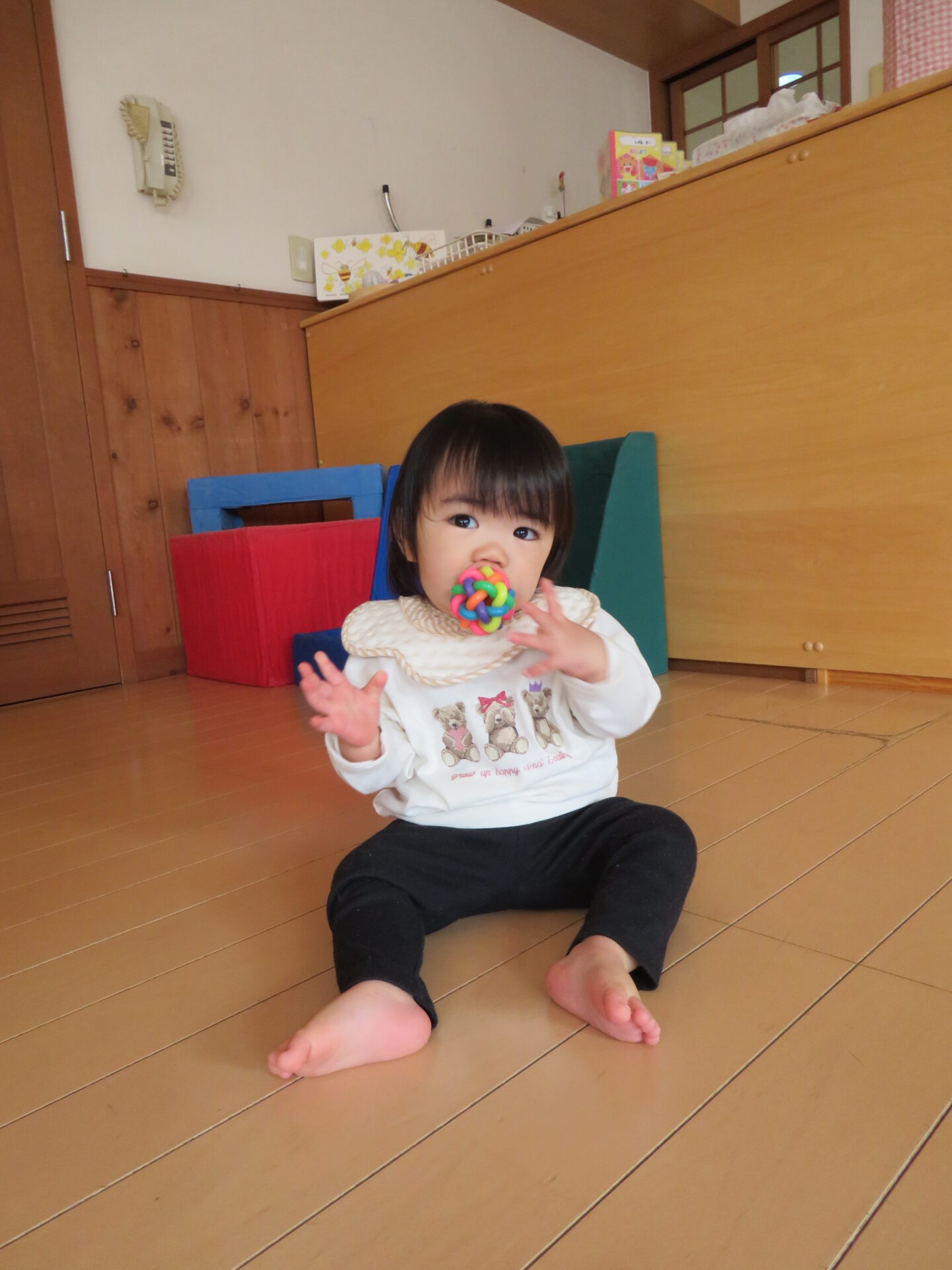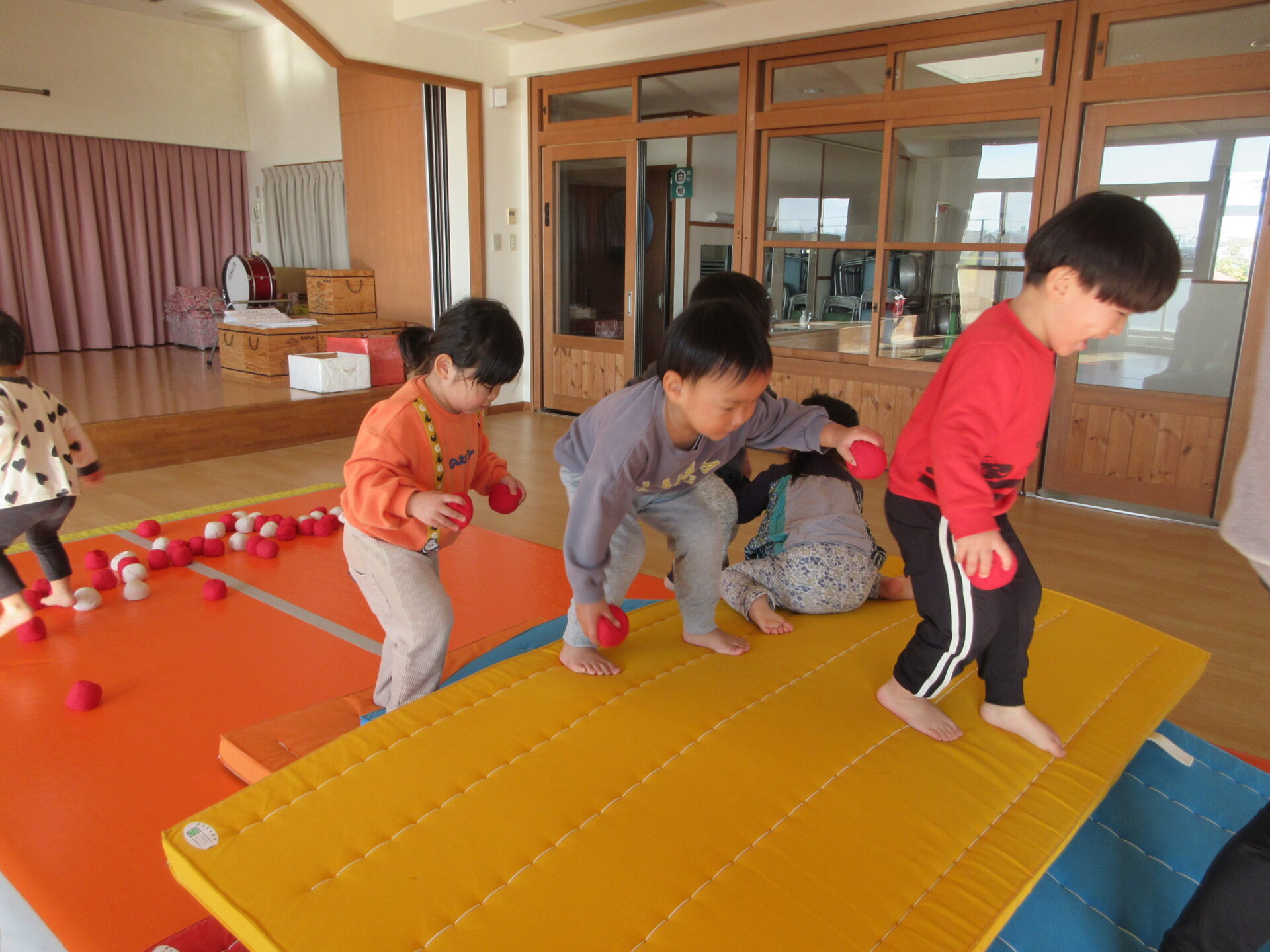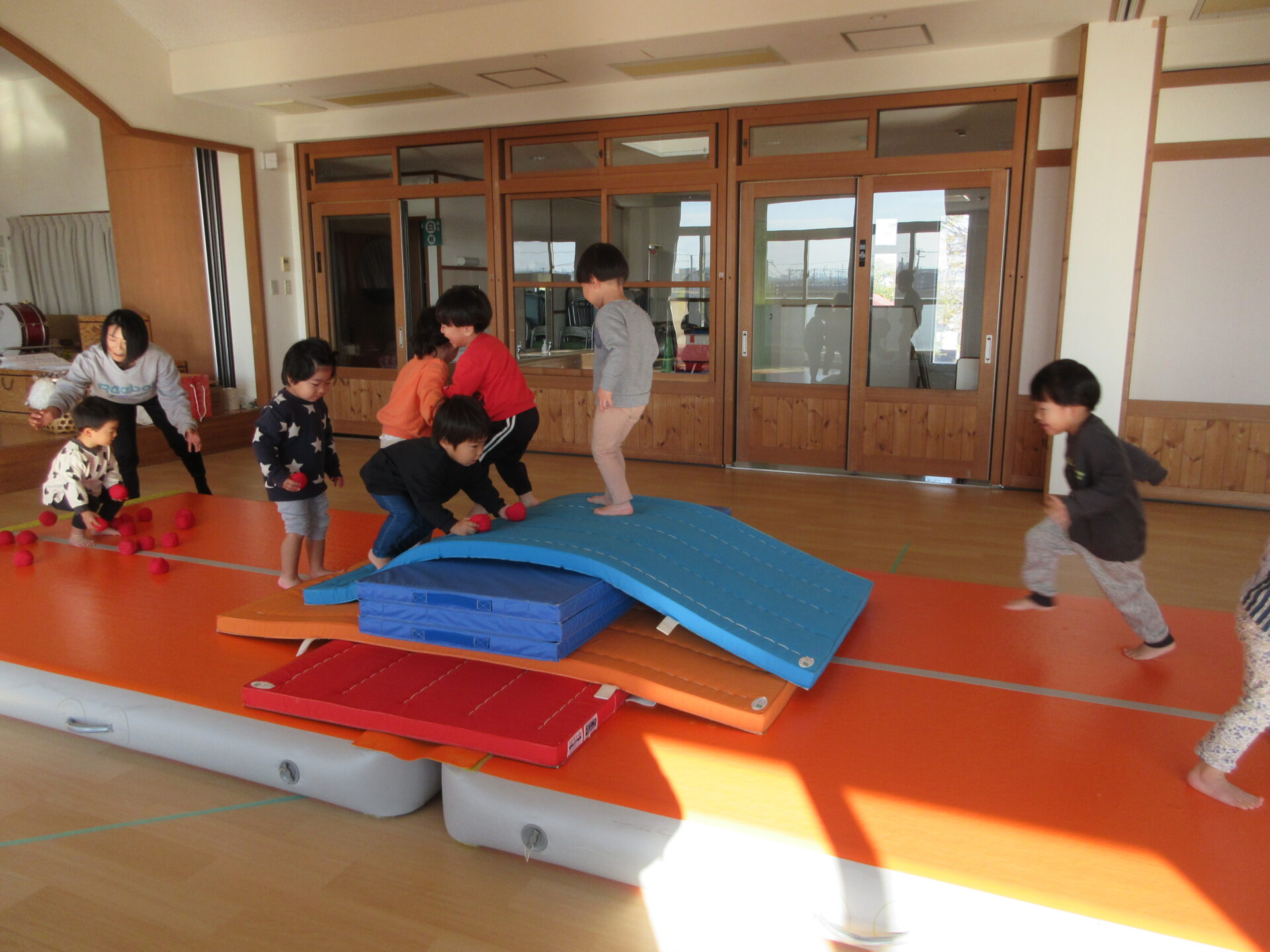 11月28日、初めての体育あそび。ボールを落とさないように坂を上るよ。赤と白、どっちかな?