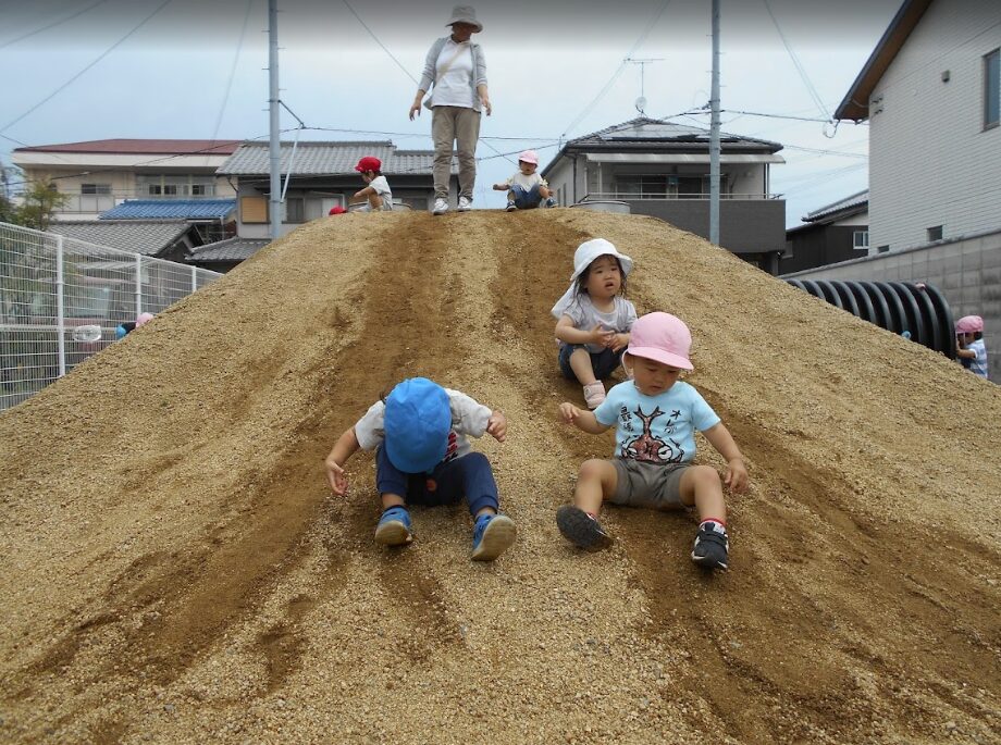 網干れんげ保育園の築山広場は、子どもたちの「やってみたい!」を引き出す、工夫いっぱいの遊び場です。