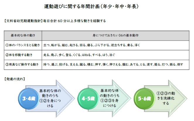 幼児期は、心と体の基礎を育むとても大切な時期。文科省の定める運動指針には、毎日合計60分以上、多様な動きを経験することが推奨されているように、毎日の運動は、体力や運動能力の向上だけでなく、意欲・集中力・協調性など、子どもたちの健やかな成長に欠かせないものです。