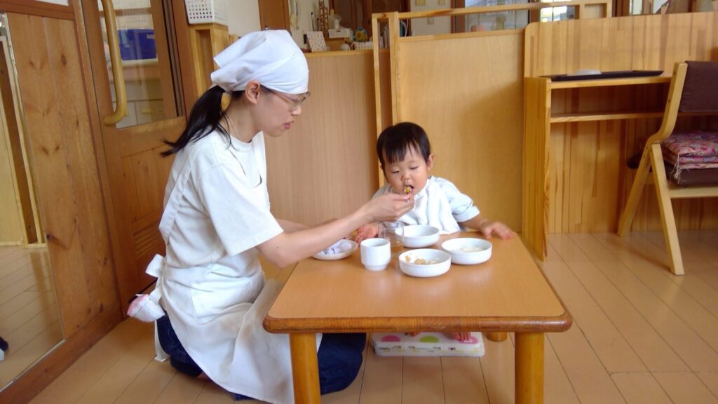 しかし、こうした方法では、子ども一人ひとりの気持ちに寄り添い、主体性を育むことは難しくなってしまいます。月齢や家庭の生活スタイルによって、睡眠時間や食事のタイミングは異なるからです。ですから、網干れんげ保育園では、ご家庭と連携しながら、それぞれの子どもに合ったタイミングで食事・排泄・着替えなどの育児を丁寧に援助しています。その際、特定の保育士が特定の子どもの育児を継続して担当することで、子どもとの間に信頼関係が育まれ、情緒が安定していきます。また、育児の援助は子どもの自立を目指すものであり、主体性を育てる大切な時間でもあります。たとえば、食事の時は実際に食材を見せながら、「今日のごはんは、肉じゃが、ひじきの煮物……」とメニューを紹介します。そして、子どもが指をさしたり、お皿を持とうとしたりして「これが食べたい」と主張してきたものを口へ運ぶようにしています。口へ運ぶ際も、スプーンを口へ押し込むのではなく、子どもが自ら口を開け、取り込めるよう援助しています。こうした日々の丁寧な関わりが、子どもの主体性を育むことにつながっていきます。